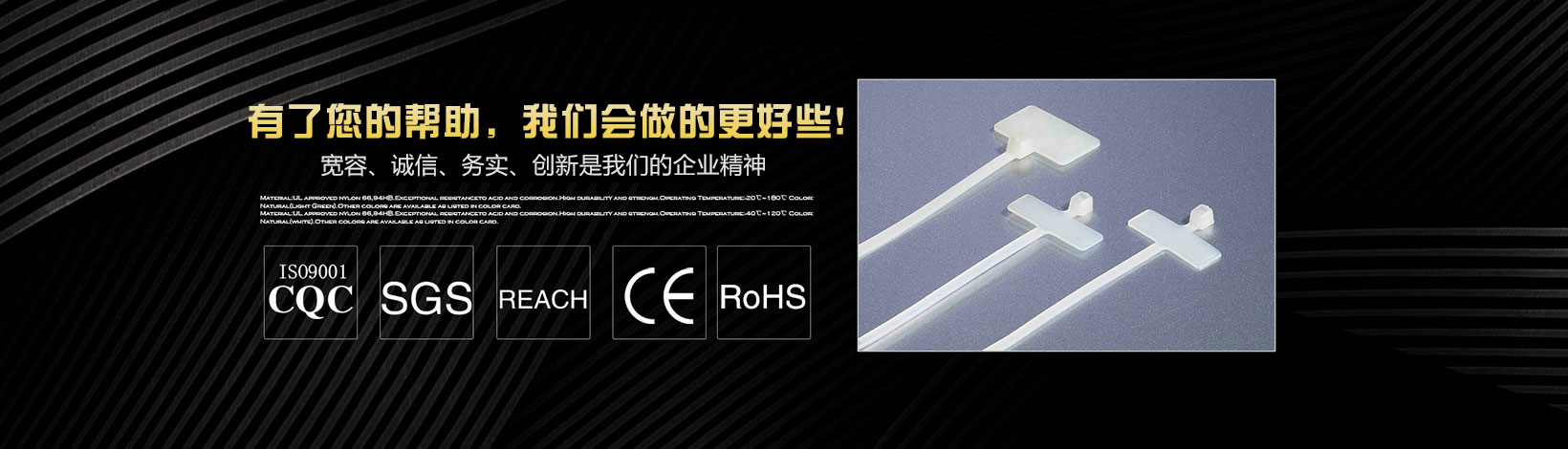 本公司專業(yè)生產銷售尼龍扎帶、特殊型扎帶、吸盤(自粘式定位片)、塑料膨脹管、尼龍壓線帽、電纜防水接頭、鋼釘線卡、R型線夾、飛機型線夾、瓷磚定位十字架、固定座、纏繞管、異型管、齒型管、號碼管、熱縮管、黃臘管、扎絲、鋼管蓋等系列產品。 我們擁有先進的檢測設備和雄厚的技術力量,并不斷優(yōu)化生產流程,規(guī)范生產環(huán)節(jié),加強完善質量控制系統,以優(yōu)異的品質深得海內外客戶的一致好評。